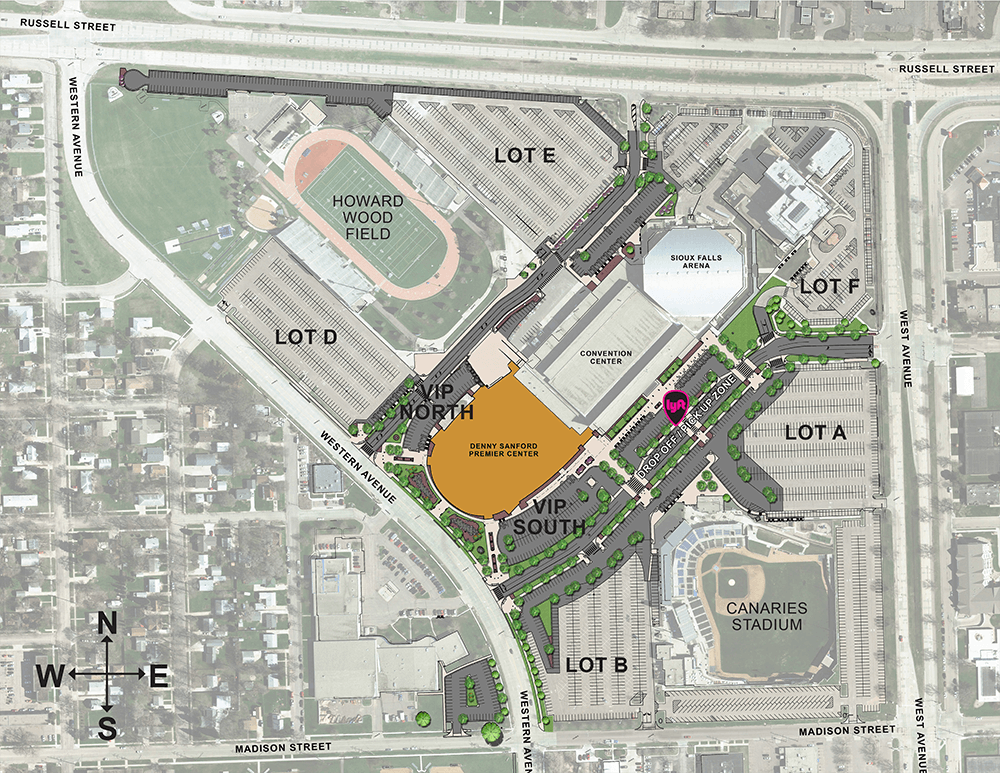 The Denny Sanford PREMIER Center offers several options for parking on-site. They have four public parking lots located around the complex that are free year-round (unless otherwise specifically noted during an event). Two lots located just to the north and south of PREMIER Center are generally free and open during the day, but are marked and used as VIP Parking during events.